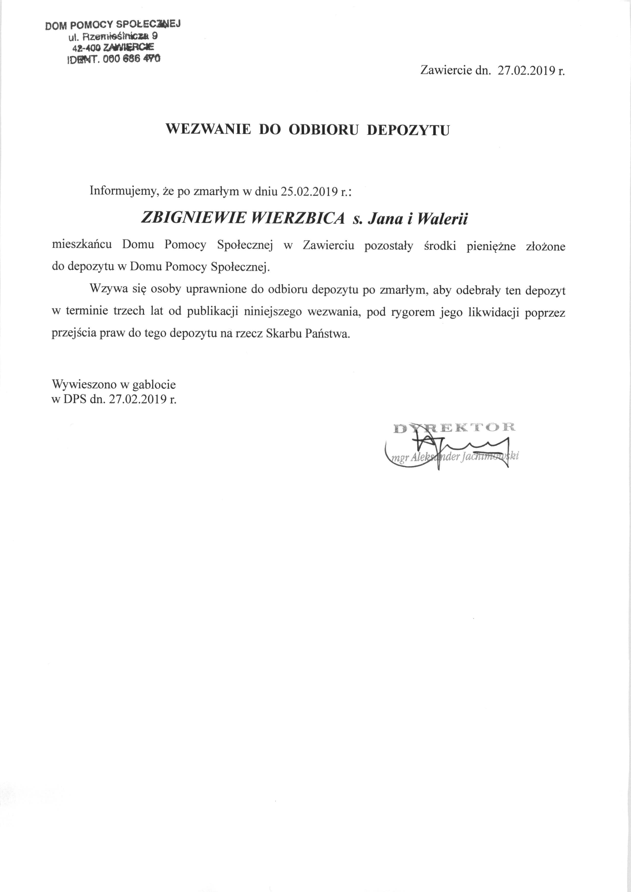 WEZWANIE DO ODBIORU DEPOZYTU Z DNIA 06.03.2013